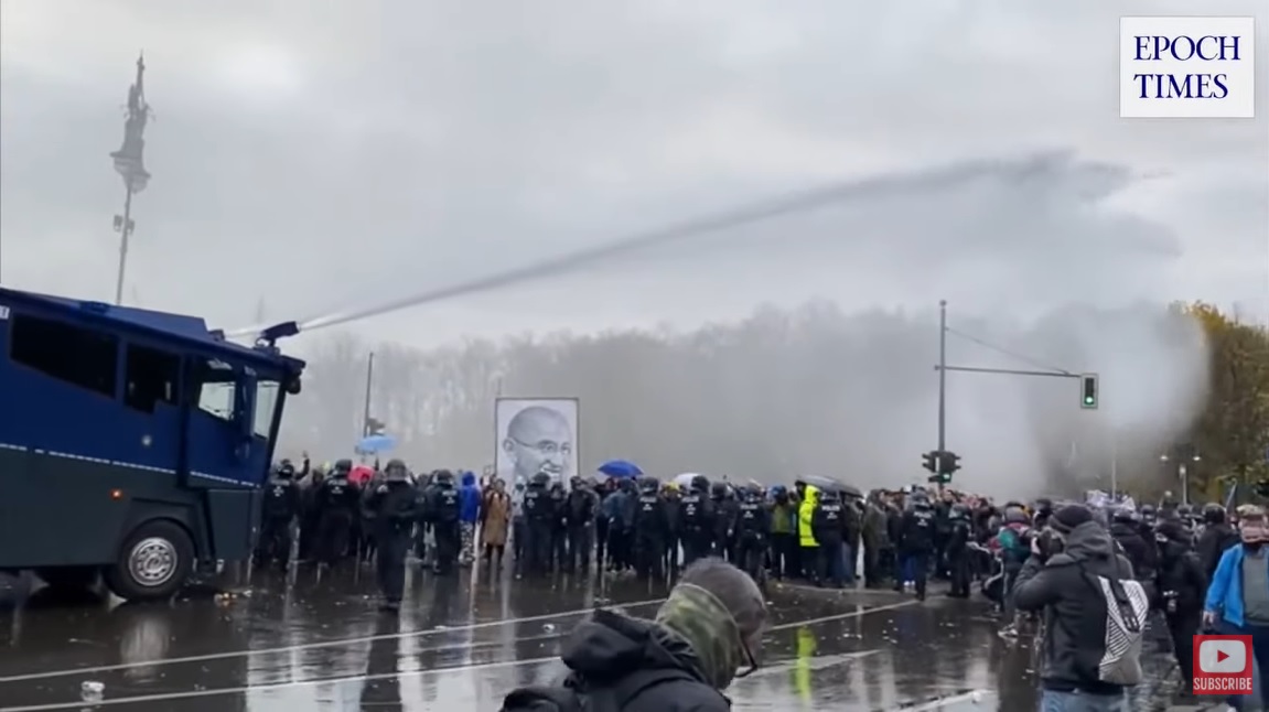 Protesty v Německu. U Braniborské brány v Berlíně se sešlo více než 10 000 lidí. Fotografie z videozáznamu pořízeném reportéry deníku The Epoch Times Německo na místě protestu. (Screenshot / YouTube) |